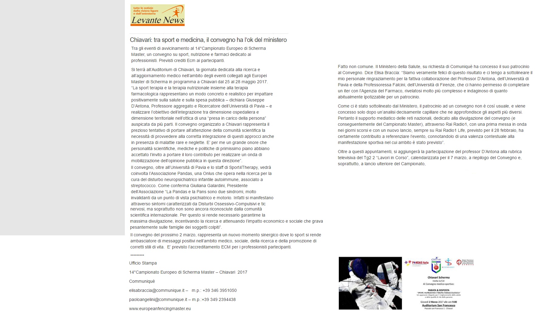 Stanno rapidamente salendo i numeri degli iscritti al 14°Campionato Europeo di Scherma Master, in programma dal 25 al 28 maggio 2017 nella capitale del Tigullio. Sono ormai quasi 800 gli atleti che hanno confermato la propria adesione agli Europei, un [...]